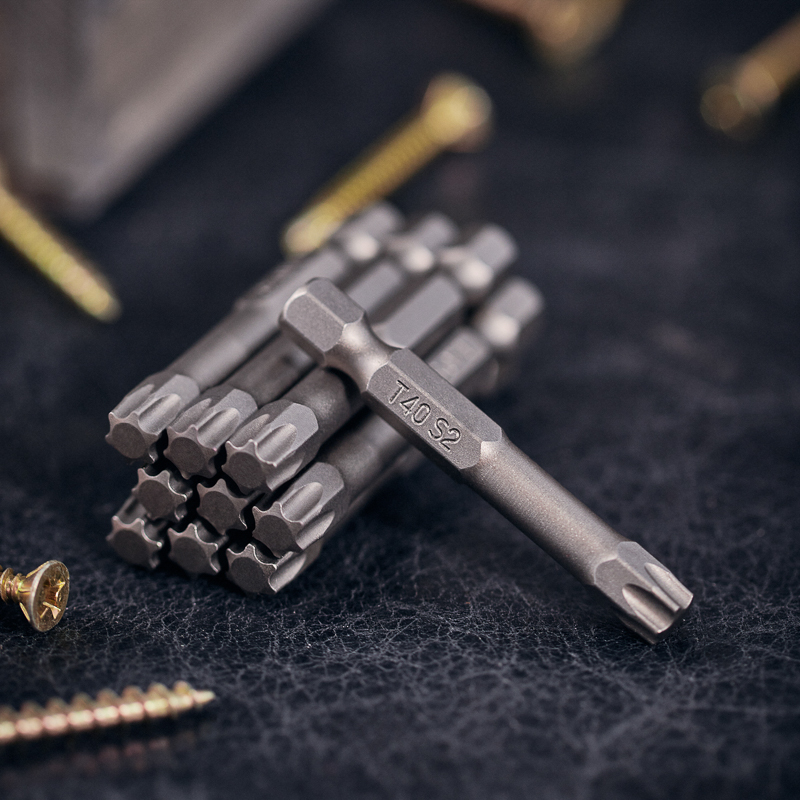 Изготовлена из легированной высокопрочной стали S2, что дает повышенную устойчивость к изломам и деформации в наиболее нагружаемых точках касания. Размер наконечника T-40 подходит для работы со шлицами с резьбовым диаметром 6,65 мм. Намагниченный наконечник облегчает крепление и фиксацию крепежа на бите. Шестигранный хвостовик надежно фиксирует биту в патроне инструмента и не дает ей проворачиваться.