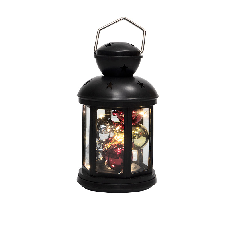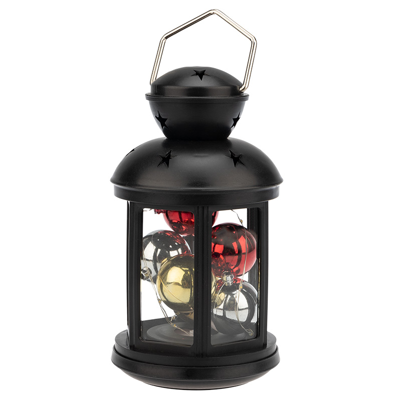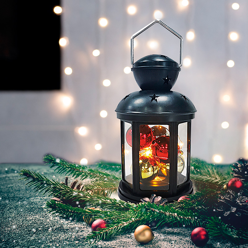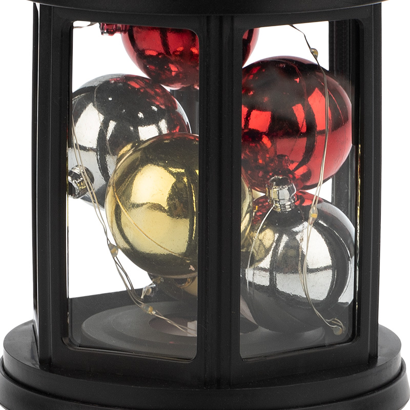 Декоративный фонарь с шариками олицетворяет тепло и домашний уют в преддверии Нового года, помогает сделать домашние вечера в кругу семьи комфортными и поднимает настроение окружающим. Оригинальное изделие в корпусе черного цвета станет стильным дополнением праздничной обстановки. Для подвешивания предусмотрено кольцо в верхней части. Экономичные диоды, подсвечивающие композицию, излучают теплый белый свет. В качестве элементов питания используются 2 батарейки типа АА, которые делают фонарь мобильным — для работы не нужна розетка.