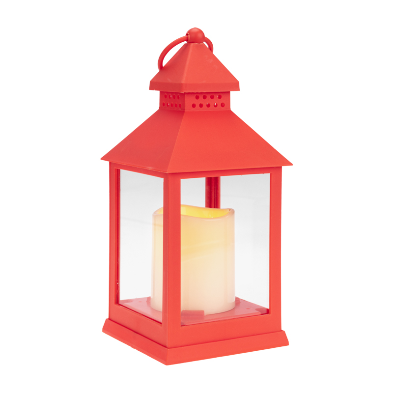 Декоративный элемент подсвечивается одним диодом, имитирующим теплое пламя свечи. Корпус красного цвета имеет высоту 24 см. Для размещения в подвешенном виде предусмотрено кольцо.