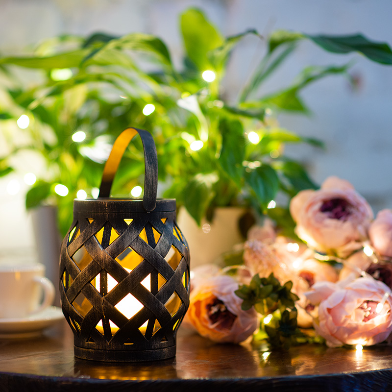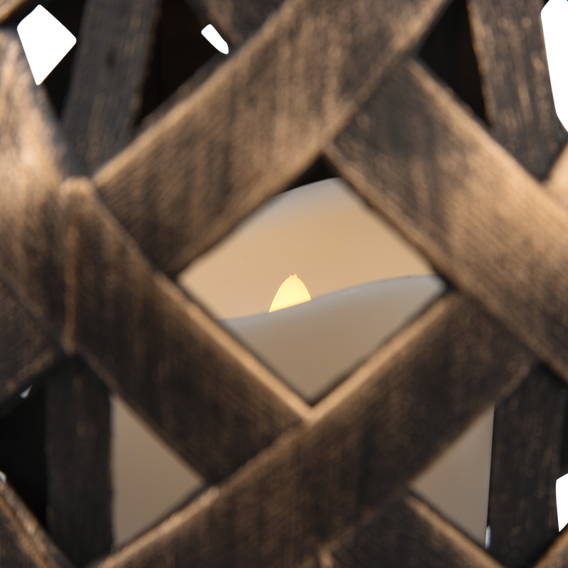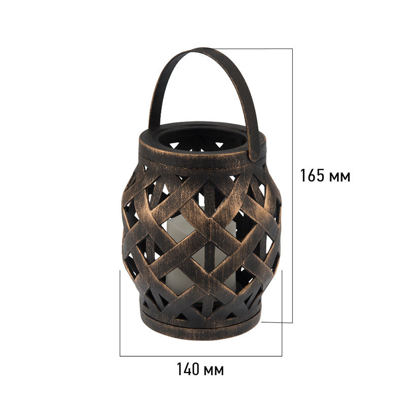 Декоративный фонарь со свечкой в плетеном корпусе бронзового цвета — стильное, оригинальное и безопасное светодиодное украшение для интерьера. В центре находится фигурка, выполненная в виде восковой свечи. Диод, излучающий белый свет теплого оттенка, имитирует настоящее пламя, не нагревается и экономно расходует энергию. Фонарь получает питание от 3 батареек типа ААА и не нуждается в розетке. На корпусе предусмотрен выключатель ON/OFF. Изделия на батарейках абсолютно безопасны в использовании.