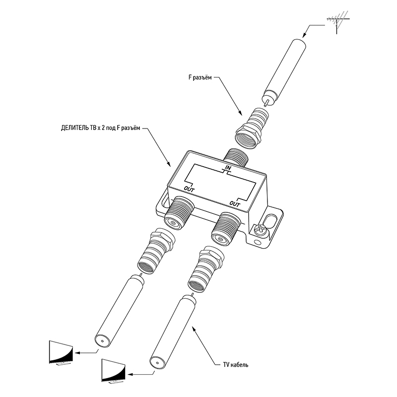 Устройство оснащено двумя выходами для сигнала и подключается с помощью стандартных F-разъемов. В комплекте поставляется 3 F-разъема.