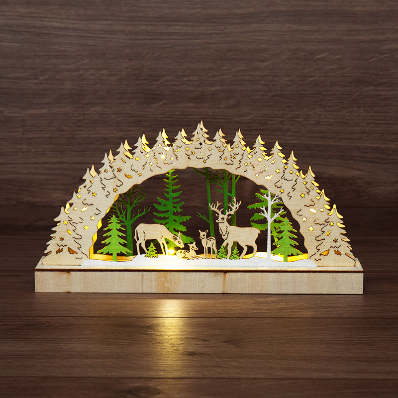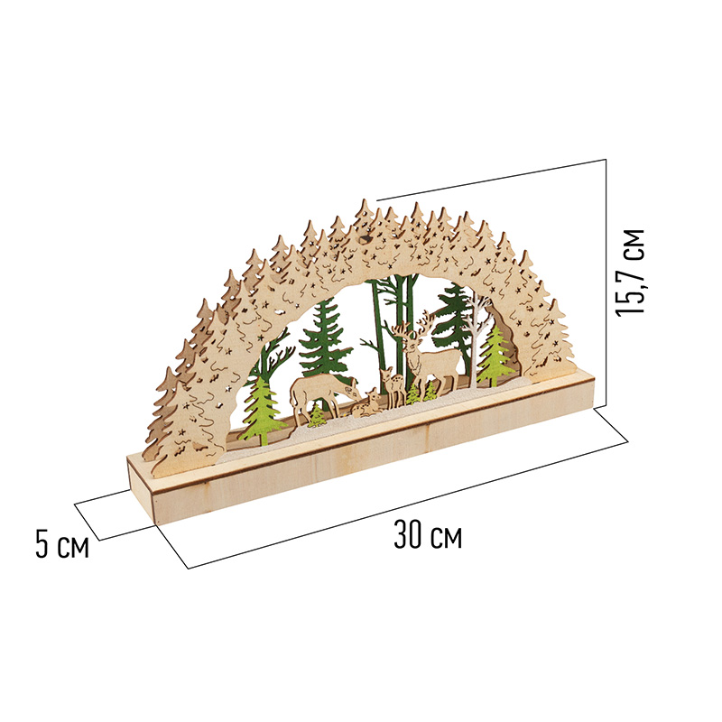 Деревянная фигурка с подсветкой «Семейство оленей» 30×5×15,7 см станет великолепным украшением интерьера, внесет нотку тепла и подарит ощущение зимней сказки окружающим. Композиция из фигур деревьев, оленей размещена на устойчивой платформе, которую можно поставить на любую ровную поверхность. Изделие выполнено из натуральной древесины. 6 безопасных светодиодов получают питание от 2 батареек типа ААА и экономно расходуют энергию, превращая ее в яркий белый свет теплого оттенка. Деревянная фигурка «Семейство оленей» предназначена для использования в сухих отапливаемых помещениях.