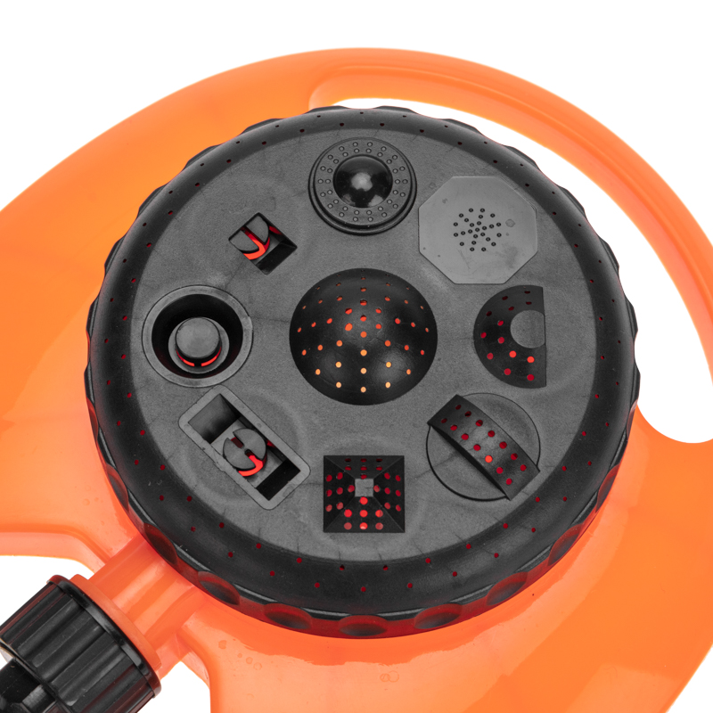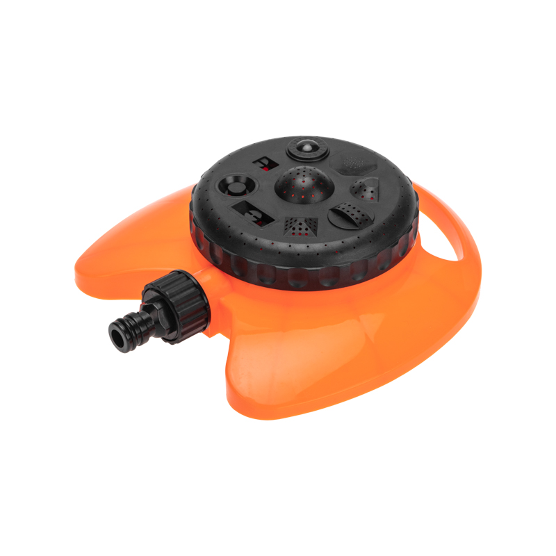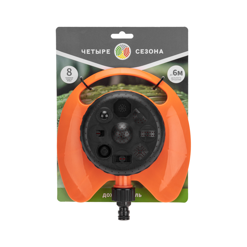 Круговой дождеватель предназначен для полива растений и почвы. Представляет собой многорежимную поворотную головку, закрепленную на неподвижной подставке. Устройство имеет 8 режимов подачи воды. Площадь орошения составляет 100 м2.
