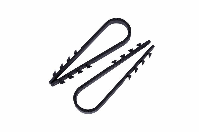 Дюбель-хомут представляет собой крепежное изделие с боковыми шипами и петлей для удержания кабеля. За счет шипов дюбель легко фиксируется в отверстии, но для его извлечения понадобится приложить усилие. Важно: для надежной фиксации дюбеля необходимо соблюдать точные параметры при сверлении отверстия, а для этого желательно использовать новую оснастку, которая не успела износиться. Дюбель может быть установлен в бетон, кирпич, дерево, газобетон и природный камень. Морозостойкие добавки добавляют крепежу устойчивость к низким температурам и позволяют использовать его на улице или в неотапливаемых помещениях.