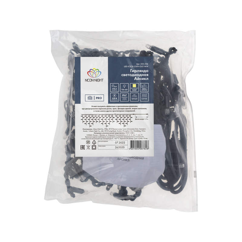 Гирлянда имитирует сосульки и может послужить оригинальным решением при украшении карнизов, арок, фасадов зданий, витрин магазинов, а также стать эффектным элементом декора внутри помещений.
