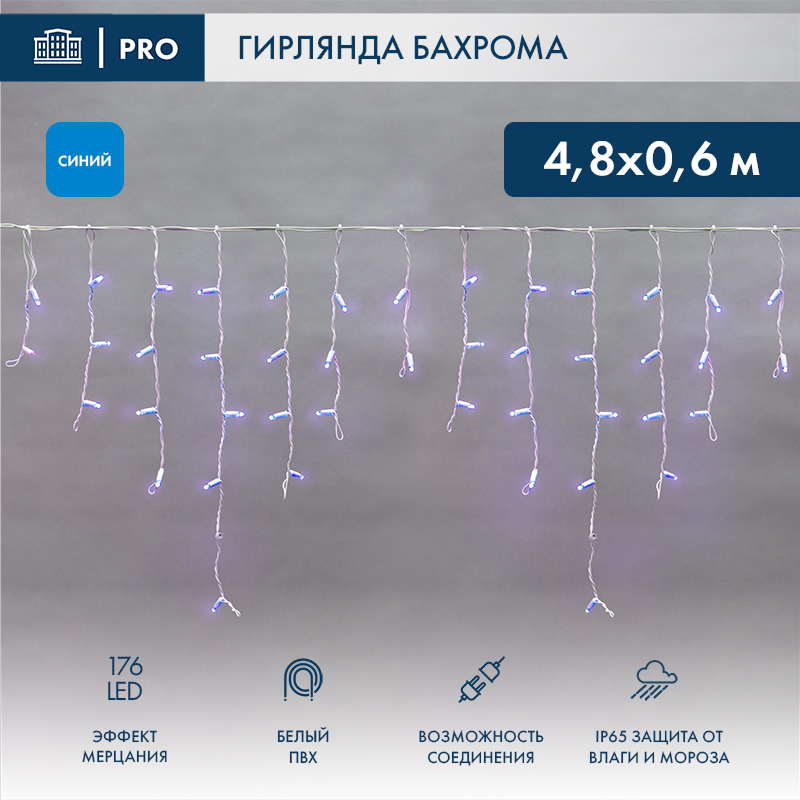 Данная гирлянда имеет синий цвет свечения и предназначена для использования как внутри помещений, так и снаружи.