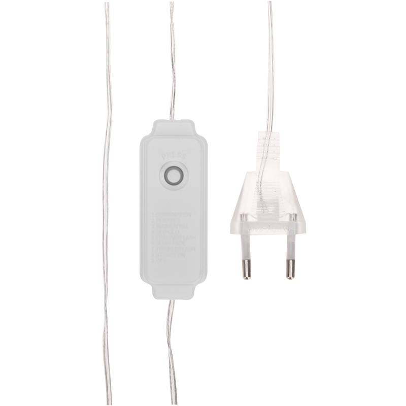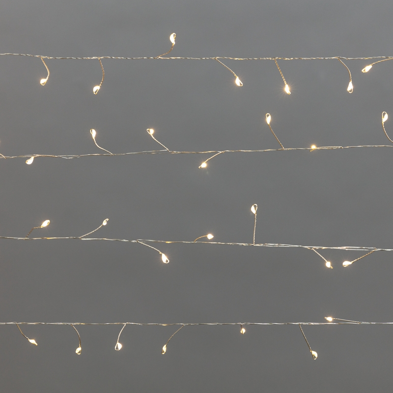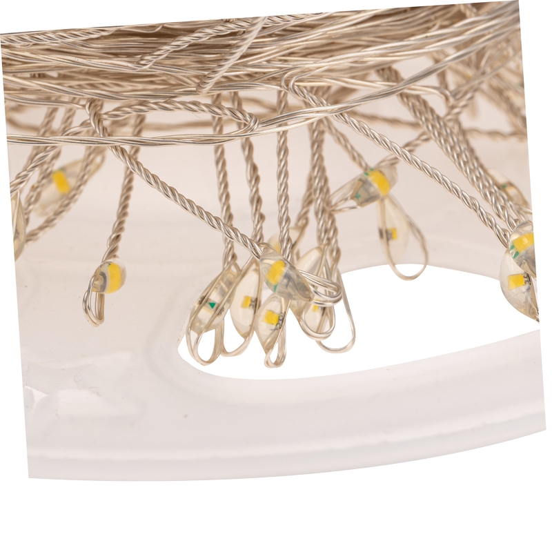 Гирлянда состоит из тонкого провода длиной 10 метров, на котором расположены 250 долговечных светодиодов с теплым белым свечением.