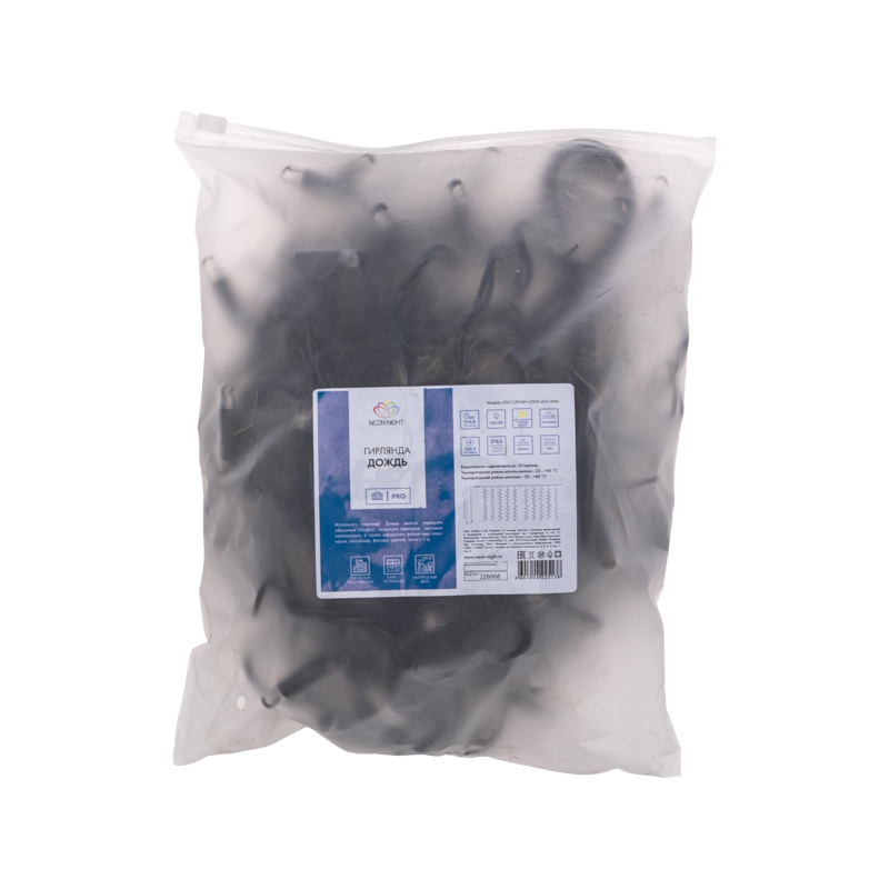 Светодиодная гирлянда Занавес (Дождь) представляет собой гибкий горизонтальный шнур-шину 2 м, к которому через определенные промежутки крепятся 20 вертикальных нитей равной длины 0,8 м со светодиодами.