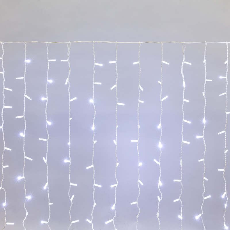Светодиодная гирлянда Занавес (Дождь) представляет собой гибкий горизонтальный шнур-шину 2 м, к которому через определенные промежутки крепятся 20 вертикальных нитей равной длины со светодиодами.