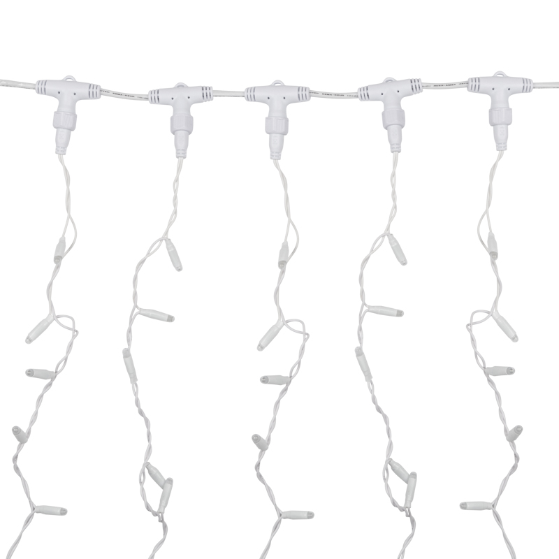 Светодиодная гирлянда Занавес (Дождь) представляет собой гибкий горизонтальный шнур-шину 2 м, к которому через определенные промежутки крепятся 20 вертикальных нитей равной длины со светодиодами.