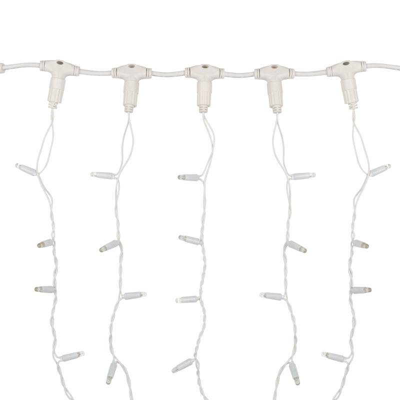 Светодиодная гирлянда Занавес (Дождь) представляет собой гибкий горизонтальный шнур-шину 2 м, к которому через определенные промежутки крепятся 20 вертикальных нитей равной длины со светодиодами.