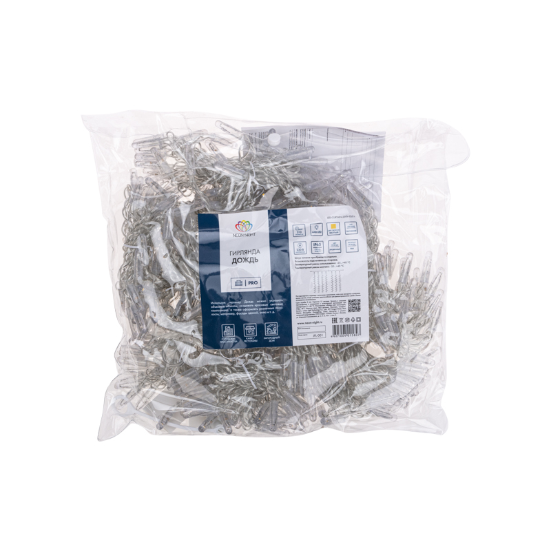 Светодиодная гирлянда Занавес (Дождь) представляет собой гибкий горизонтальный шнур-шину 2 м, к которому через определенные промежутки крепятся 16 вертикальных нитей равной длины со светодиодами.
