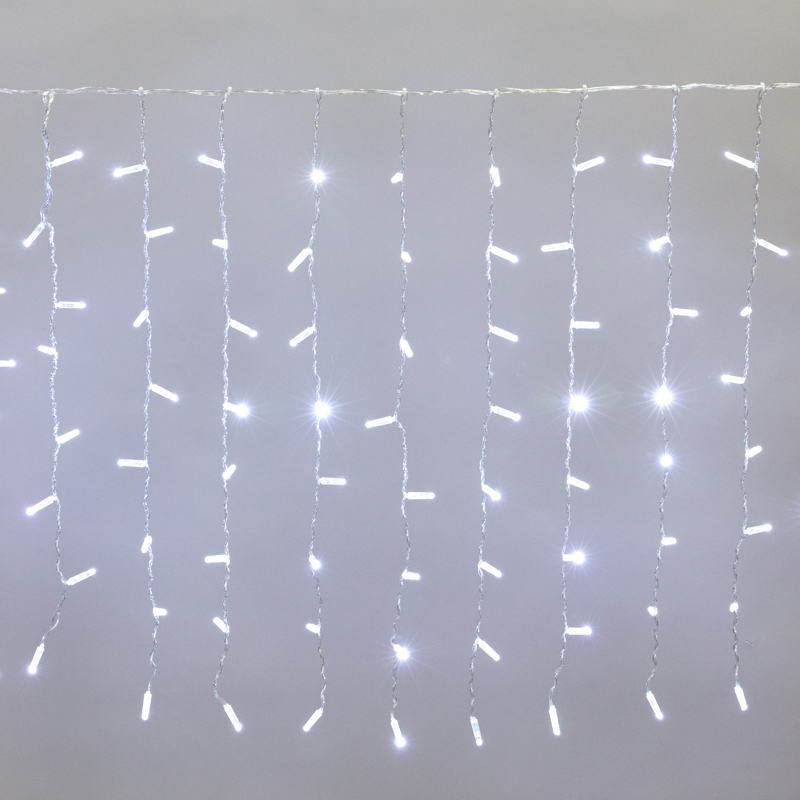 Светодиодная гирлянда Занавес (Дождь) представляет собой гибкий горизонтальный шнур-шину 2 м, к которому через определенные промежутки крепятся 20 вертикальных нитей равной длины 0,8 м со светодиодами.