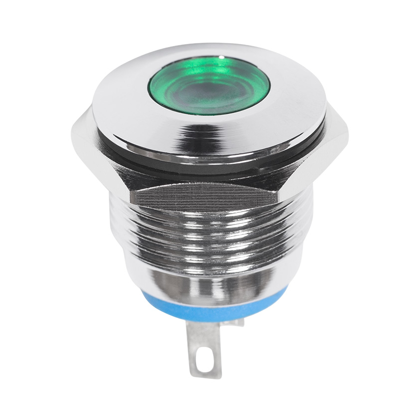 Индикатор металл Ø16 12В подсв/зеленая LED предназначен для индикации состояния электрических цепей. Такие индикаторы устанавливаются на лицевых панелях управления электрооборудованием (в объектах энергоснабжения, измерительных приборах, блоках питания, легковых и грузовых автомобилях, и других местах) с рабочим напряжением не более 12В. Разнообразные цветовые варианты исполнения позволяют эффективно комплектовать панели управления. Изделие состоит из двух основных частей - лицевой части (головки) и контактной. Монтаж осуществляется без применения винтов на плоских панелях толщиной от 0.5мм до 5мм, с помощью гайки. Подключение контактов осуществляется с помощью пайки.