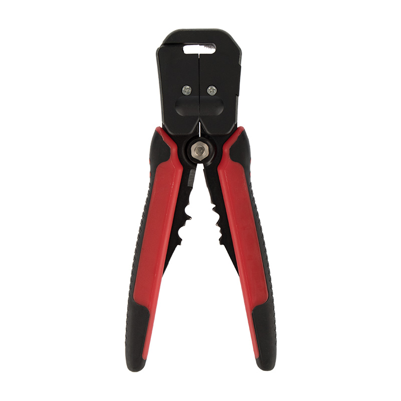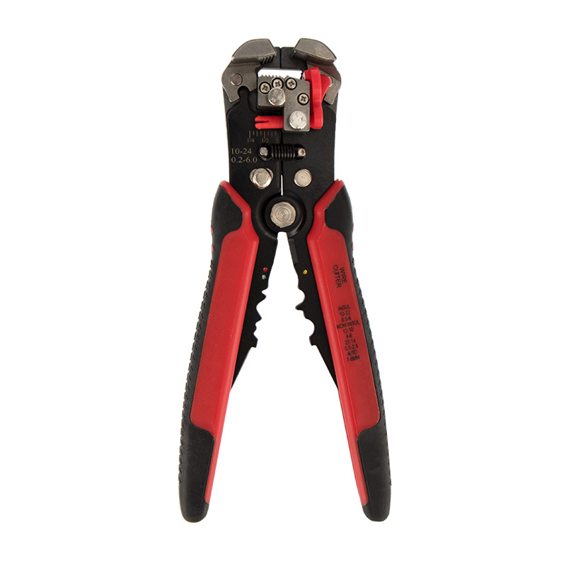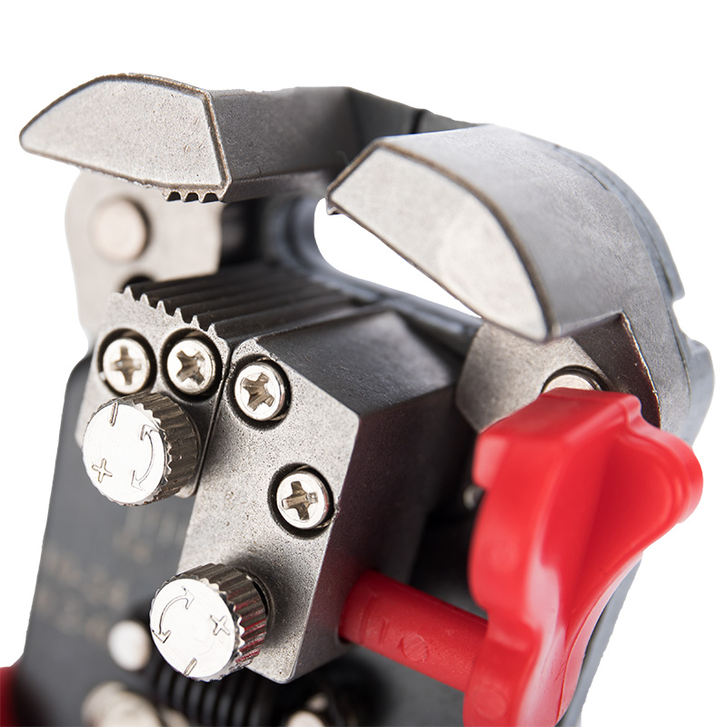 Корпус стриппера изготовлен из высокопрочной инструментальной стали, благодаря чему устойчив к механическим воздействиям и имеет продолжительный срок службы. В конструкции стриппера предусмотрен ограничитель длины зачистки провода и возвратная пружина, которая обеспечивает обратный ход рукояток и упрощает процесс работы с инструментом. Регулятор усилия зажима провода позволяет адаптировать инструмент под различные типы и размеры изоляции и не повредить сам провод при снятии изоляции. Также стриппер оснащен режущей кромкой для равномерной обрезки проводников. Двухкомпонентные защитные рукоятки с резиновыми вставками не дают инструменту выскальзывать из руки при работе.