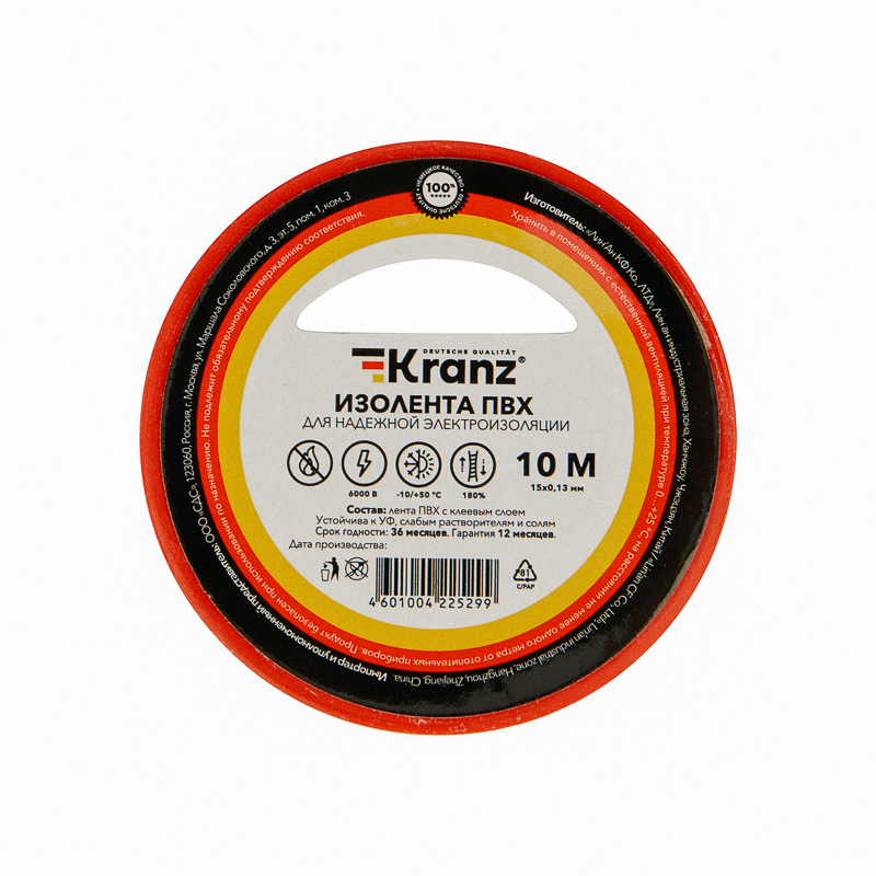 Изолента ПВХ 0,13х15мм, 10м, красная KRANZ