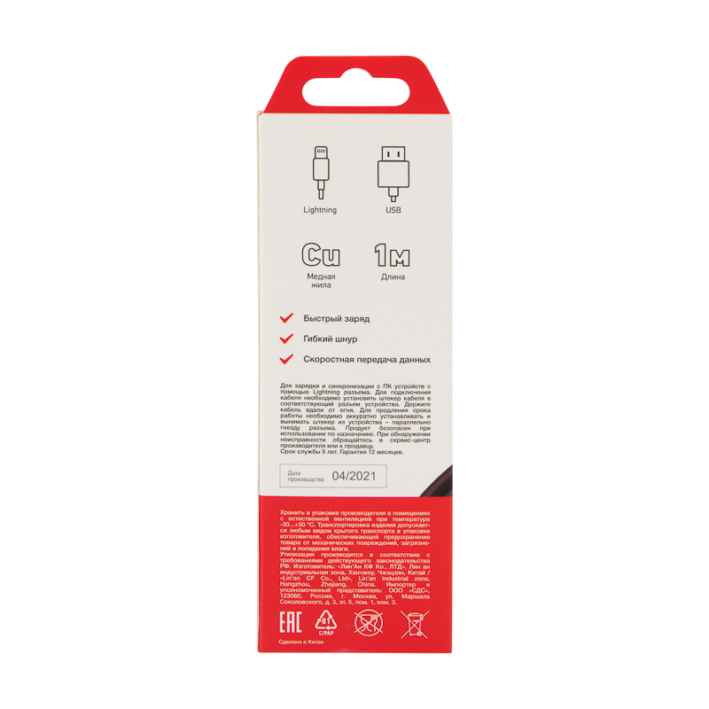 Кабель оснащен двумя разъемами: на одном конце располагается разъем USB-A, а на другом – разъем Lightning.