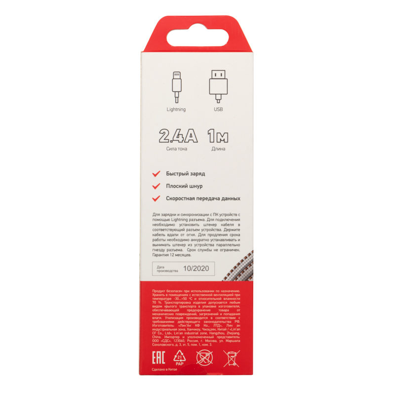 Кабель оснащен двумя разъемами: на одном конце располагается разъем USB-A, а на другом – разъем Lightning.