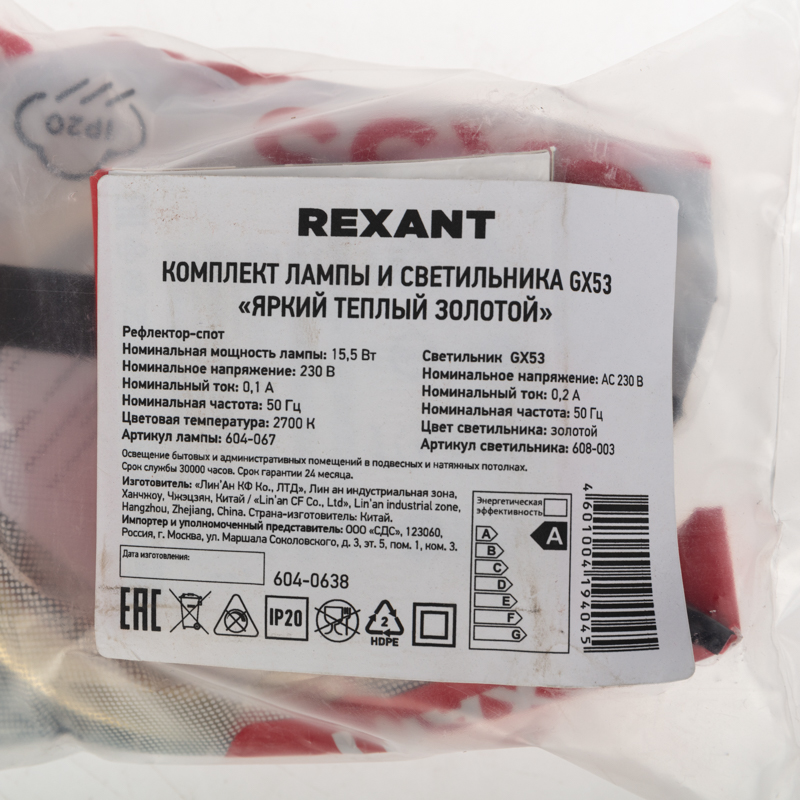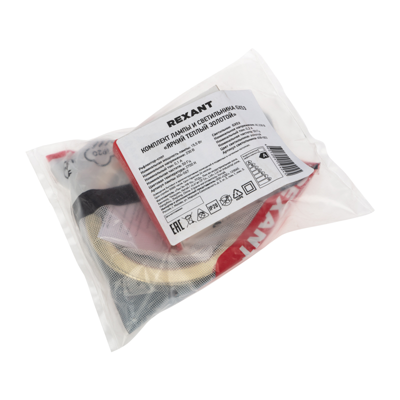 Комплект REXANT, состоящий из лампы и светильника GX53, предназначен для освещения бытовых и административных помещений в подвесных и натяжных потолках.