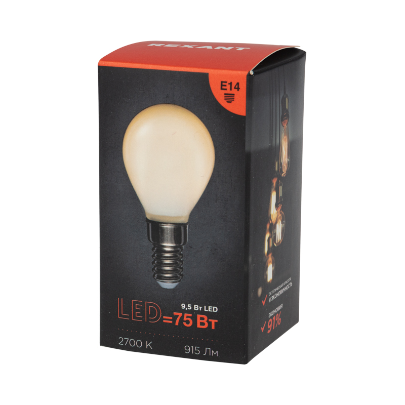 Лампа филаментная Шарик GL45 9,5Вт 915Лм 2700K E14 матовая колба REXANT