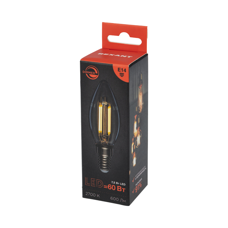 Лампа филаментная Свеча CN35 7,5Вт 600Лм 2700K E14 диммируемая, прозрачная колба REXANT