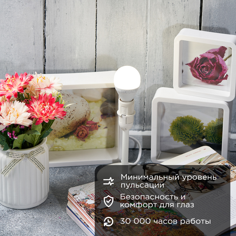 Светодиодная лампа с цоколем Е14 мощностью 9,5Вт выполнена в форме шара. Лампа с такой колбой не раздражает глаз и излучает нейтральный свет (4000K) без вредного мерцания.
