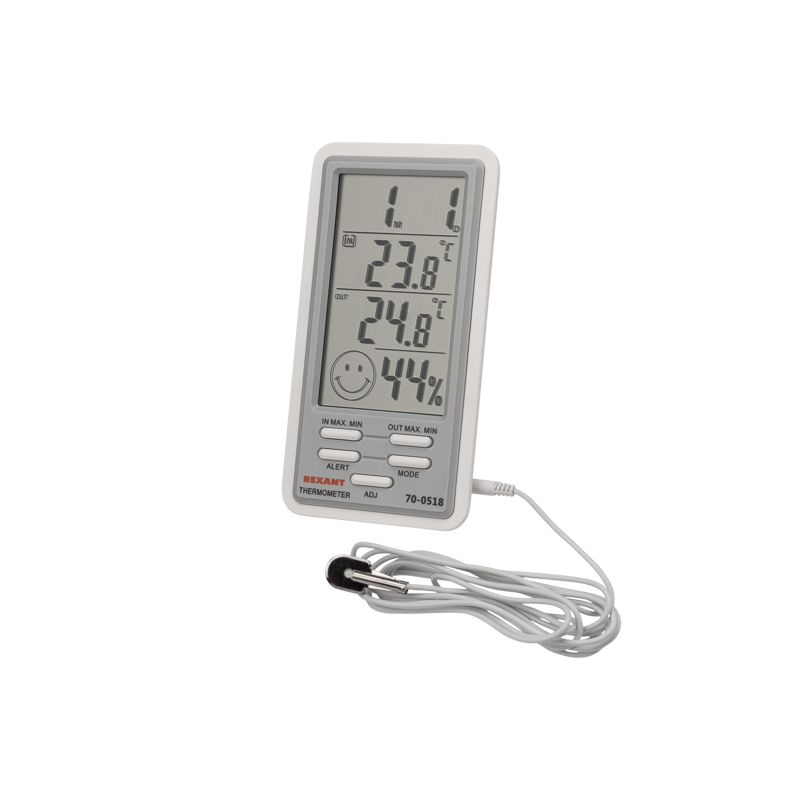 Комнатно-уличная метеостанция REXANT предназначена для измерения показаний температуры внутри и снаружи помещений, а также для измерения влажности в комнате.