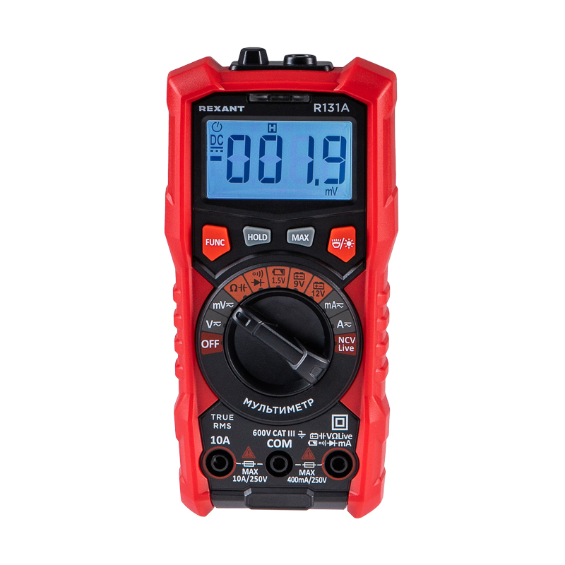 Портативный цифровой мультиметр R131A REXANT представляет собой современное устройство, которое позволяет измерить переменный ток, произвести тест батарей и аккумуляторов до 12В, определить фазу и нейтраль.