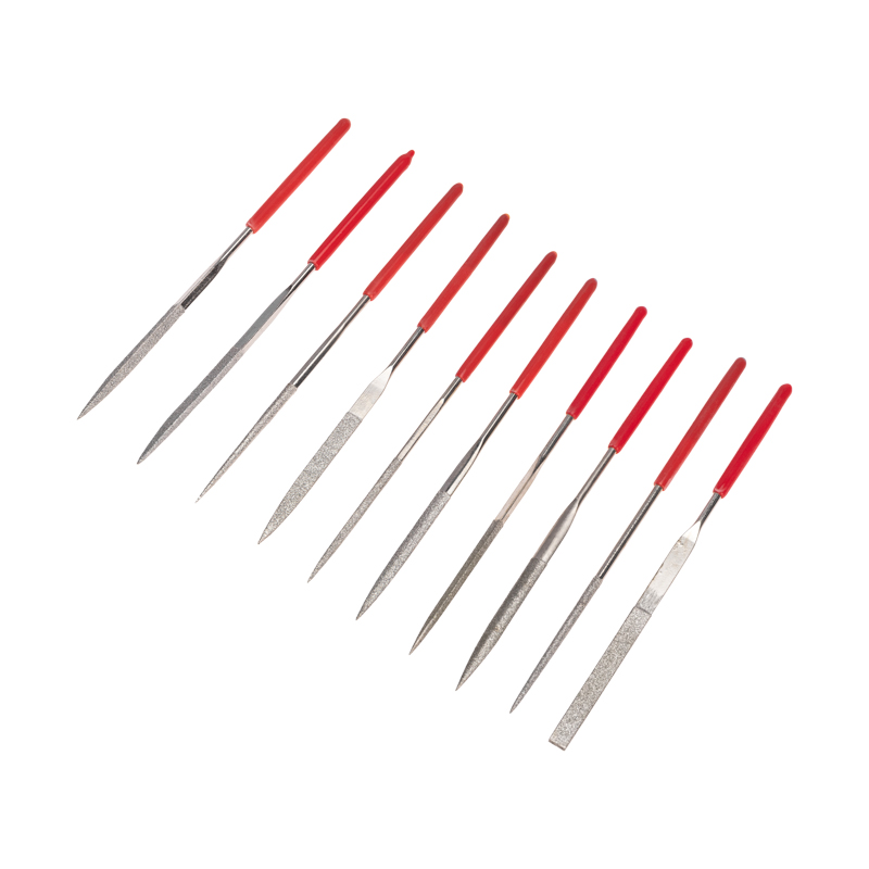 Набор комплектуется десятью надфилями с напылением из алмазной крошки, которые применяются для мелких слесарных работ с особо твердыми материалами: металлом, керамической плиткой, стеклом и др.