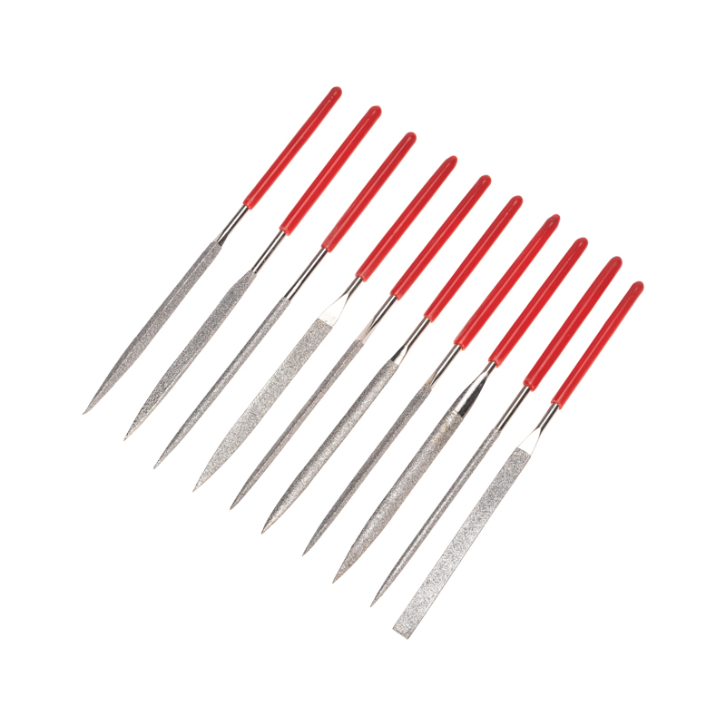 Набор комплектуется десятью надфилями с напылением из алмазной крошки, которые применяются для мелких слесарных работ с особо твердыми материалами: металлом, керамической плиткой, стеклом и др.
