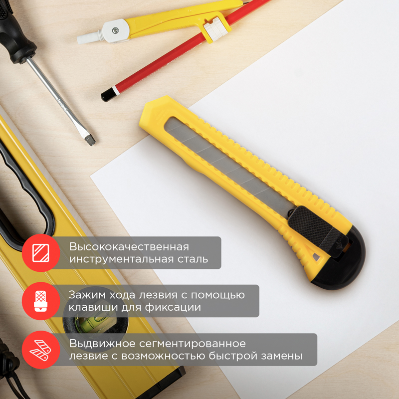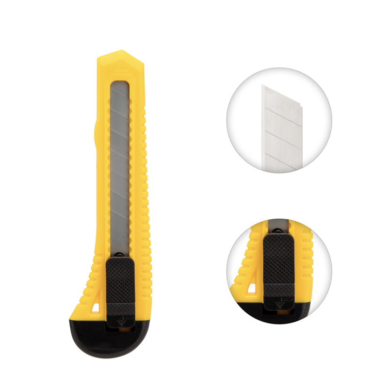 Корпус ножа выполнен пластика. Сегментированное лезвие шириной 18 мм изготовлено из высококачественной инструментальной стали. Когда крайний сегмент затупляется, его можно отломить и продолжить использование инструмента.