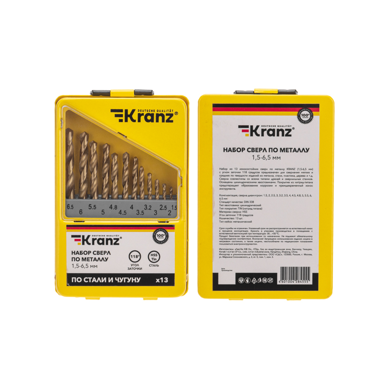 Набор из 13 износостойких сверл по металлу KRANZ (1,5-6,5 мм) с углом заточки 118 градусов предназначен для сверления мягких и средних по твердости изделий из металла, стали, пластика, дерева и т.д. Сверла совместимы со всеми типами дрелей и сверлильных станков. Оснащены цилиндрическими хвостовиками.