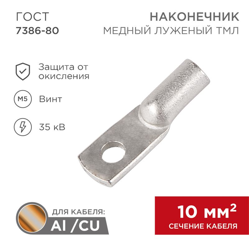 Наконечник ТМЛ 10-10-5 (10мм² - Ø5мм) REXANT предназначен для оконцевания проводов и кабелей с медными и алюминиевыми жилами посредством опрессовки для последующего болтового соединения проводника с оборудованием или шиной.