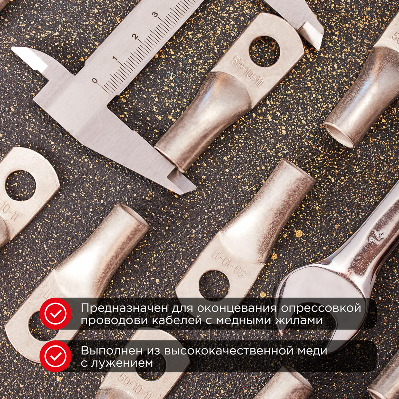 Наконечник ТМЛ 50–10–11 (50мм² - Ø10мм) REXANT предназначен для оконцевания проводов и кабелей с медными и алюминиевыми жилами посредством опрессовки для последующего болтового соединения проводника с оборудованием или шиной.