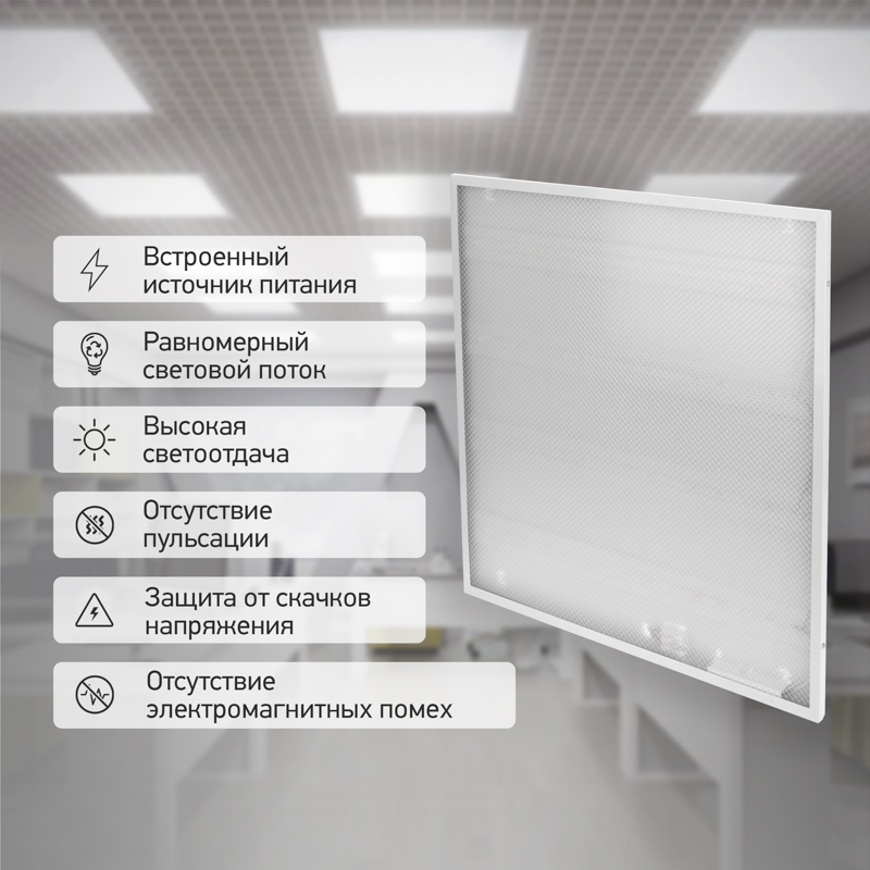 Светодиодная панель LAMPER предназначена для освещения офисных помещений, учебных, медицинских и административных учреждений, а также других мест общественного пользования. Благодаря размерам 595х595 при высоте 19 мм устройство подходят для установки как накладным, так и подвесным способом. Драйвер встроен в корпус панели и не мешает распределению светового потока.