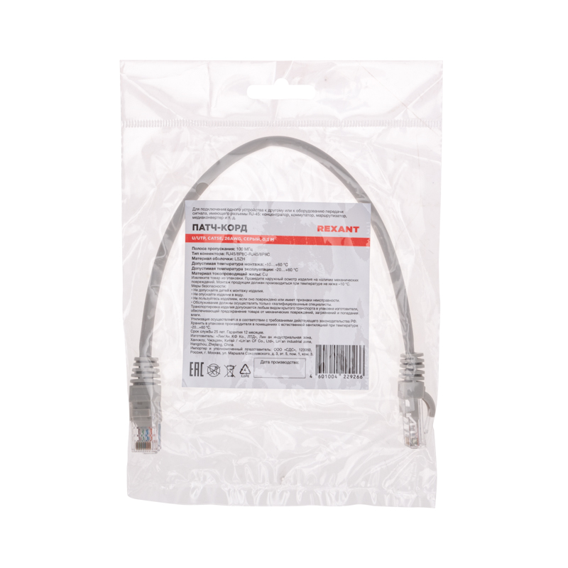 Патч-корд U/UTP, CAT 5e, RJ45-RJ45, 26AWG, LSZH, серый, 0,3м REXANT