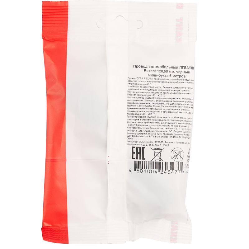 Цвет провода – черный, сечение – 1х0,50 мм, длина – 5 м.