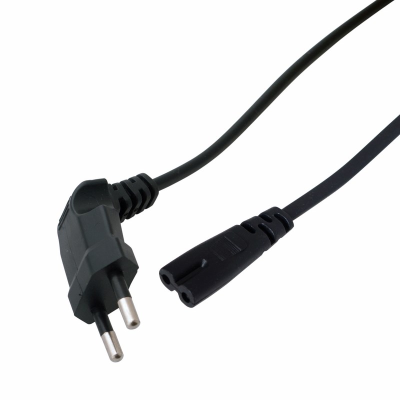 Шнур сетевой СЕЕ 7/16 - IEC 320 C7 2x0.75 мм² 1.5 м REXANT предназначен для подключения к сети переменного тока (AC) с напряжением 220 B аудио- и видеоаппаратуры, источников питания ноутбуков, игровых консолей и других приборов, имеющих штыревой сетевой разъем типа С8 (известен из-за его формы как «восьмерка»). Данный сетевой шнур (IEC cord) состоит из двухжильного провода с сечением проводника 0.75 мм², с одной стороны угловой литой вилкой СЕЕ 7/16 и с другой — литого гнездового неполяризованного разъема типа IEC 320 C7