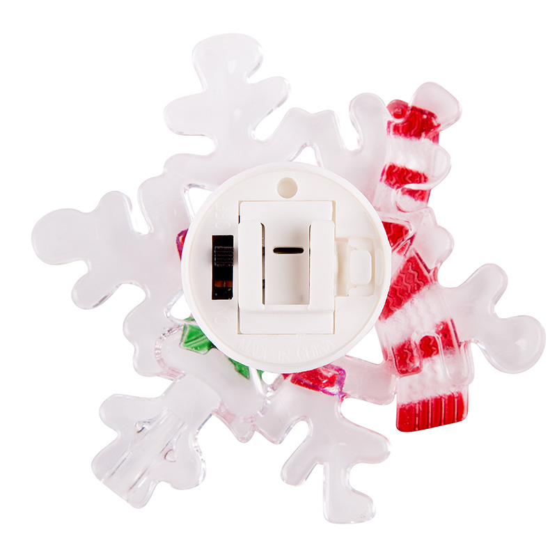 Светодиодная фигурка «Снеговик на снежинке» выполнена из прочного пластика. Прозрачная снежинка с изображением веселого персонажа крепится на любые гладкие поверхности при помощи присоски. В центре композиции находится яркий диод RGB, который светится разноцветными огнями, меняя оттенки в хаотичном порядке — в гамме 256 вариантов. На оборотной стороне расположен батарейный блок, рассчитанный на установку трех элементов питания типа LR41 (идут в комплекте). Светодиодная фигурка отлично смотрится на окне, зеркале, мебельных фасадах.
