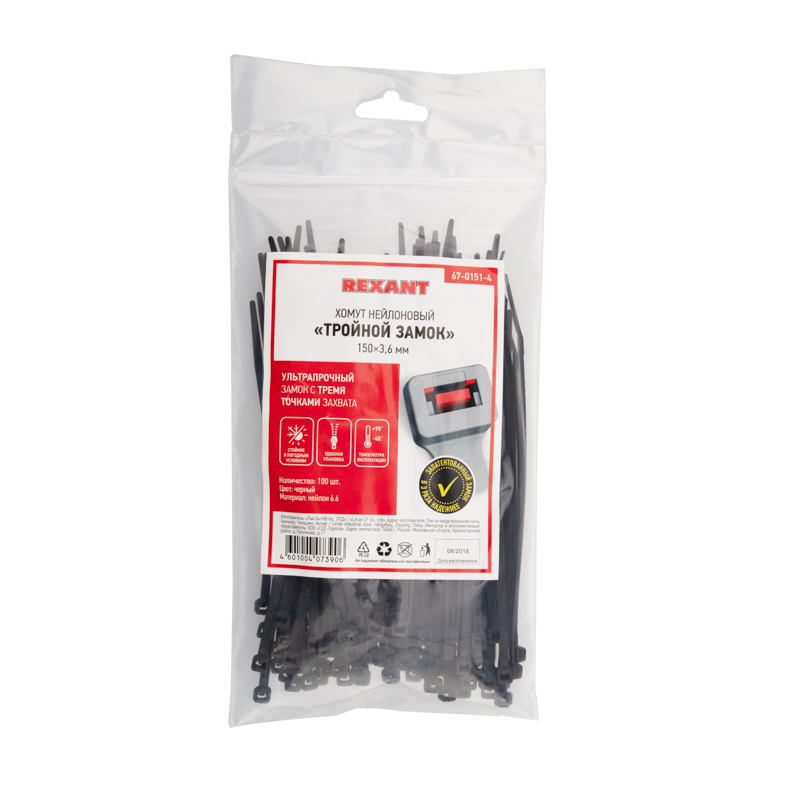 Представляет собой черную нейлоновую полоску с высоким уровнем гибкости размером 150x3,6 мм. Стяжка изготовлена из нейлона-6,6, износостойкого и прочного материала.