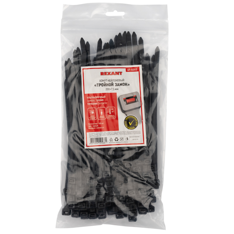 Изделия упакованы в герметичные пакеты многоразового использования с замком Zip-Lock. Этот тип упаковки обеспечивает удобное хранение и защиту от пыли, а также предотвращает потерю влаги. Стяжки упакованы в наборы по 100 штук.