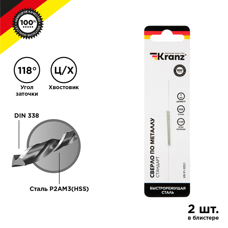 Сверло по металлу 1,0х34х12мм (HSS), DIN 338, 2 шт. в упаковке KRANZ