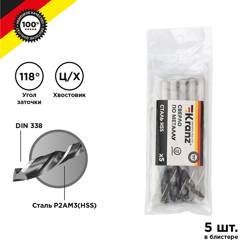 Сверло по металлу 10,0х133х87мм (HSS), DIN 338, 5 шт. в упаковке KRANZ