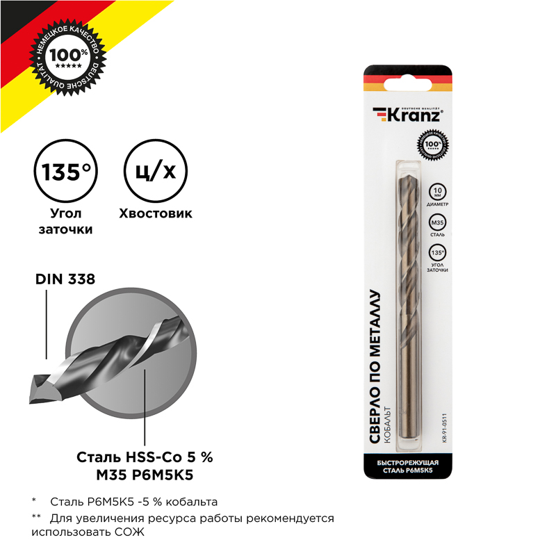 Сверло по металлу 10х133х87мм «Кобальт» (сталь HSS-Co 5% M35 P6M5K5) DIN 338, 1 шт. в блистере KRANZ