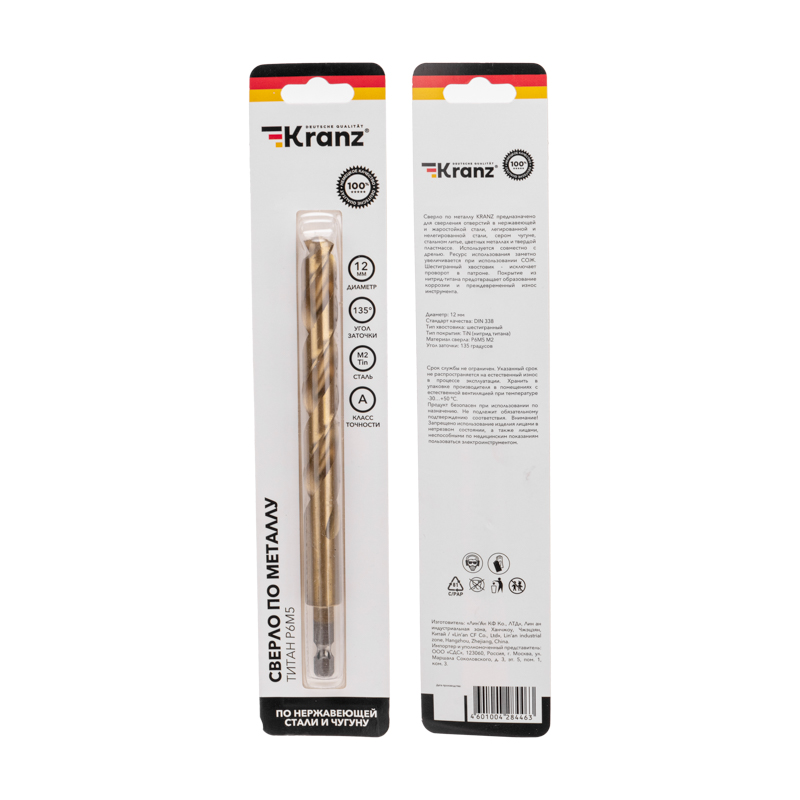 Сверло по металлу, 12мм, Р6М5, ТИТАН, шестигранный хвостовик (1 шт. в упаковке) DIN 338 KRANZ