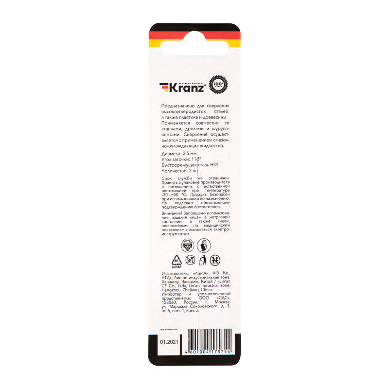 Сверло по металлу 2,5х57х30мм (HSS), DIN 338, 2 шт. в упаковке KRANZ