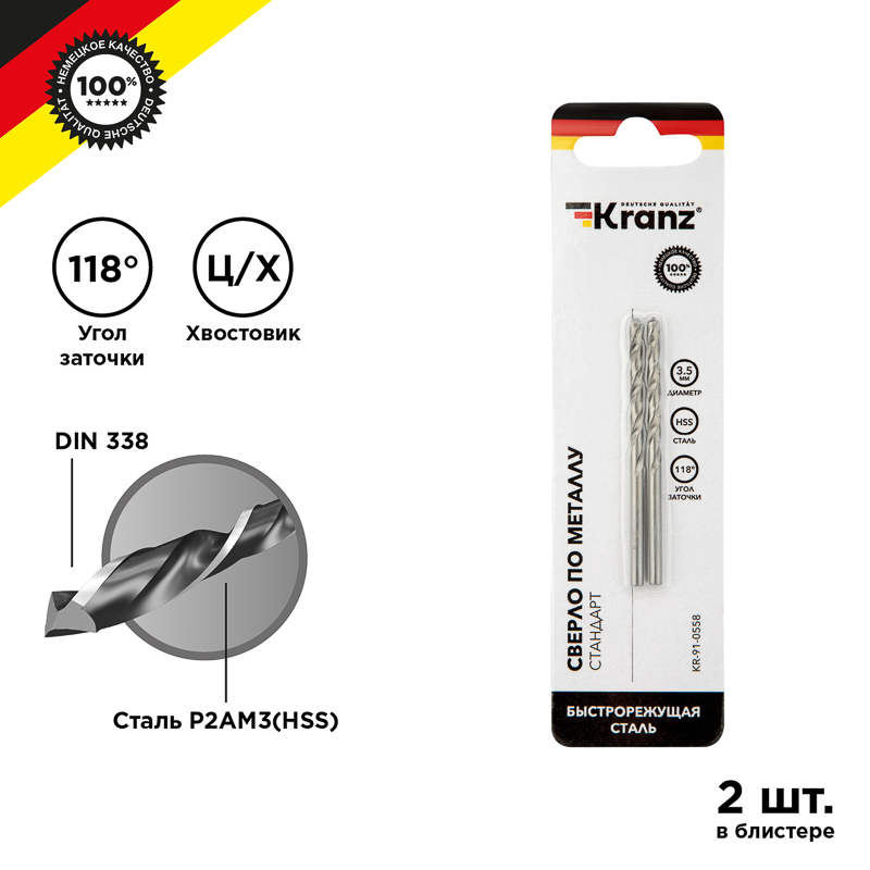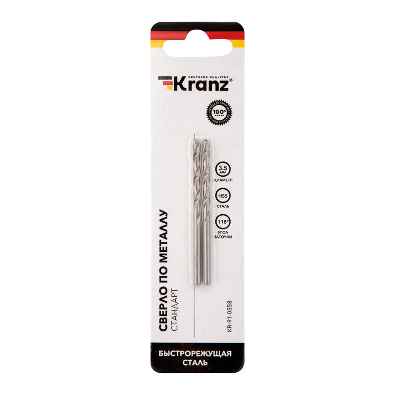 Сверло по металлу 3,5х70х39мм (HSS), DIN 338, 2 шт. в упаковке KRANZ