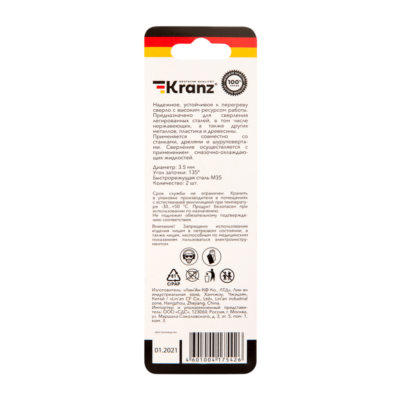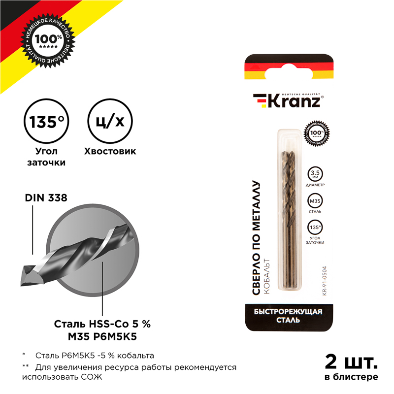 Сверло по металлу 3,5х70х39мм «Кобальт» (сталь HSS-Co 5% M35 P6M5K5) DIN 338, 2 шт. в блистере KRANZ