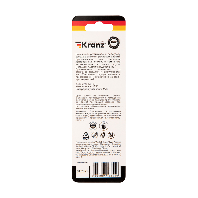 Сверло по металлу 4,5х80х47мм «Кобальт» (сталь HSS-Co 5% M35 P6M5K5) DIN 338, 1 шт. в блистере KRANZ