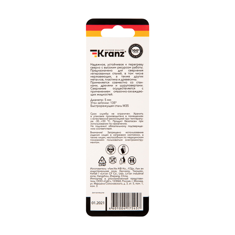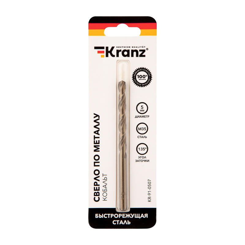 Сверло по металлу 5х86х52мм «Кобальт» (сталь HSS-Co 5% M35 P6M5K5) DIN 338, 1 шт. в блистере KRANZ